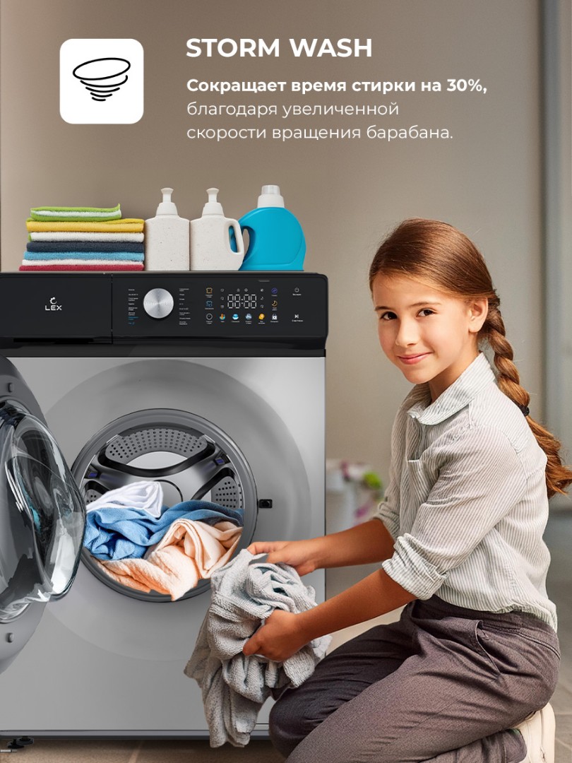 - Storm Wash: ускоряет процесс стирки за счет более интенсивного, но плавного увеличения оборотов. Качественная стирка за 15 минут — это реально! Интеллектуальная система автоматически определит вес белья и установит оптимальное время стирки.