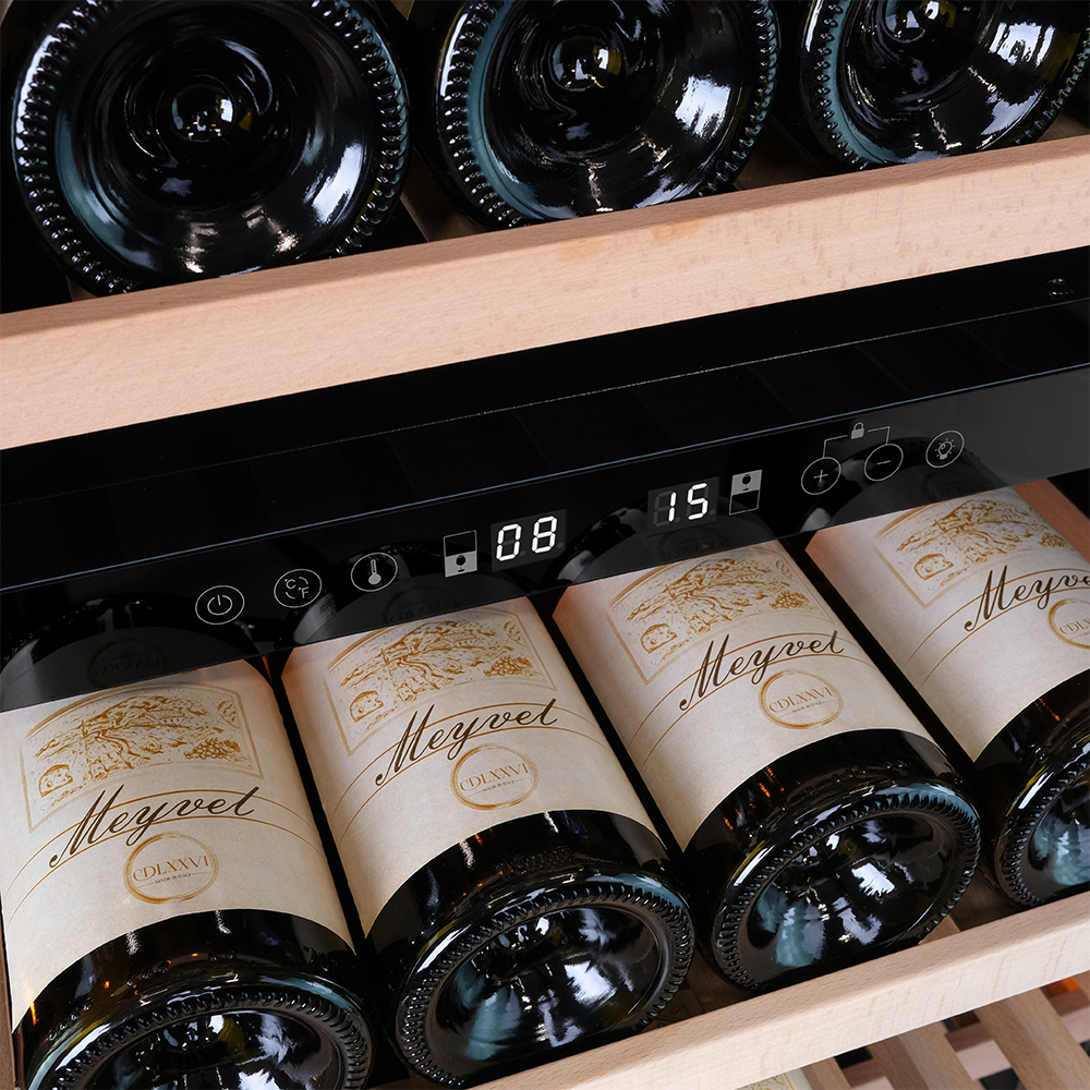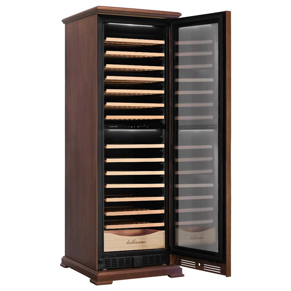 Винный шкаф предназначен для профессионального и длительного хранения различных сортов вин (до 174 бутылок типа Бордо). Он так же оснащен дверью с защитой от ультрафиолетовых лучей и поддерживает влажность в диапазоне 60-80%, как в настоящем винном погребе. Стальной корпус обшит натуральным буком, который выдерживает большие нагрузки и обладает красивой текстурой.