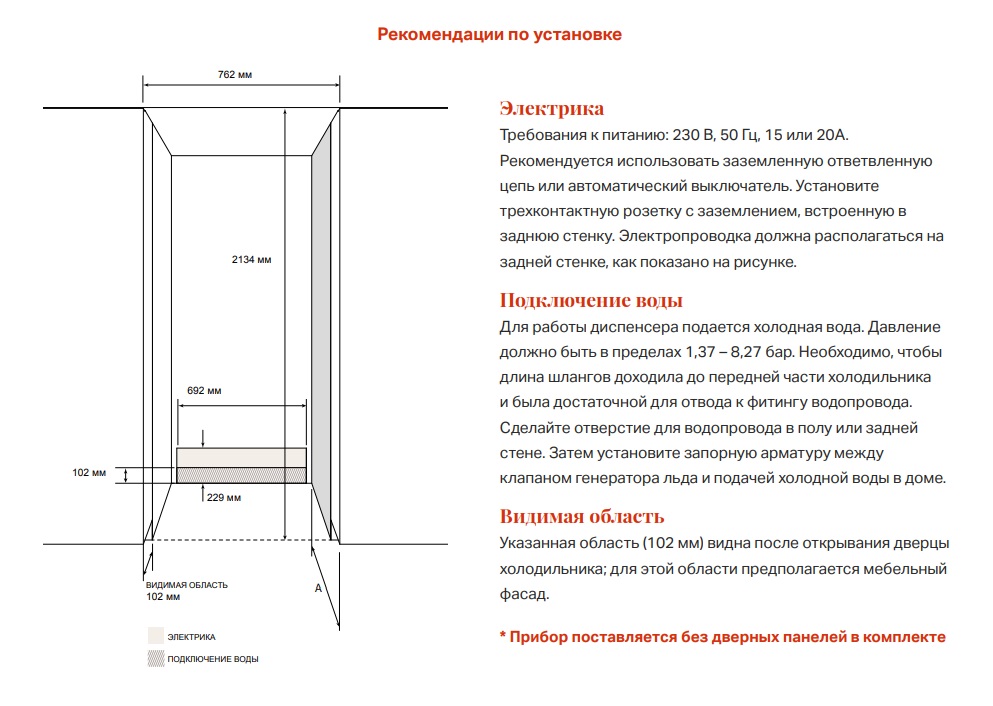 В линейке приборов есть два размера – 75 и 60 см. В боковую стенку встроен диспенсер для воды. Внутренние части прибора выполнены из нержавеющей стали, стекла и АБС-пластика.